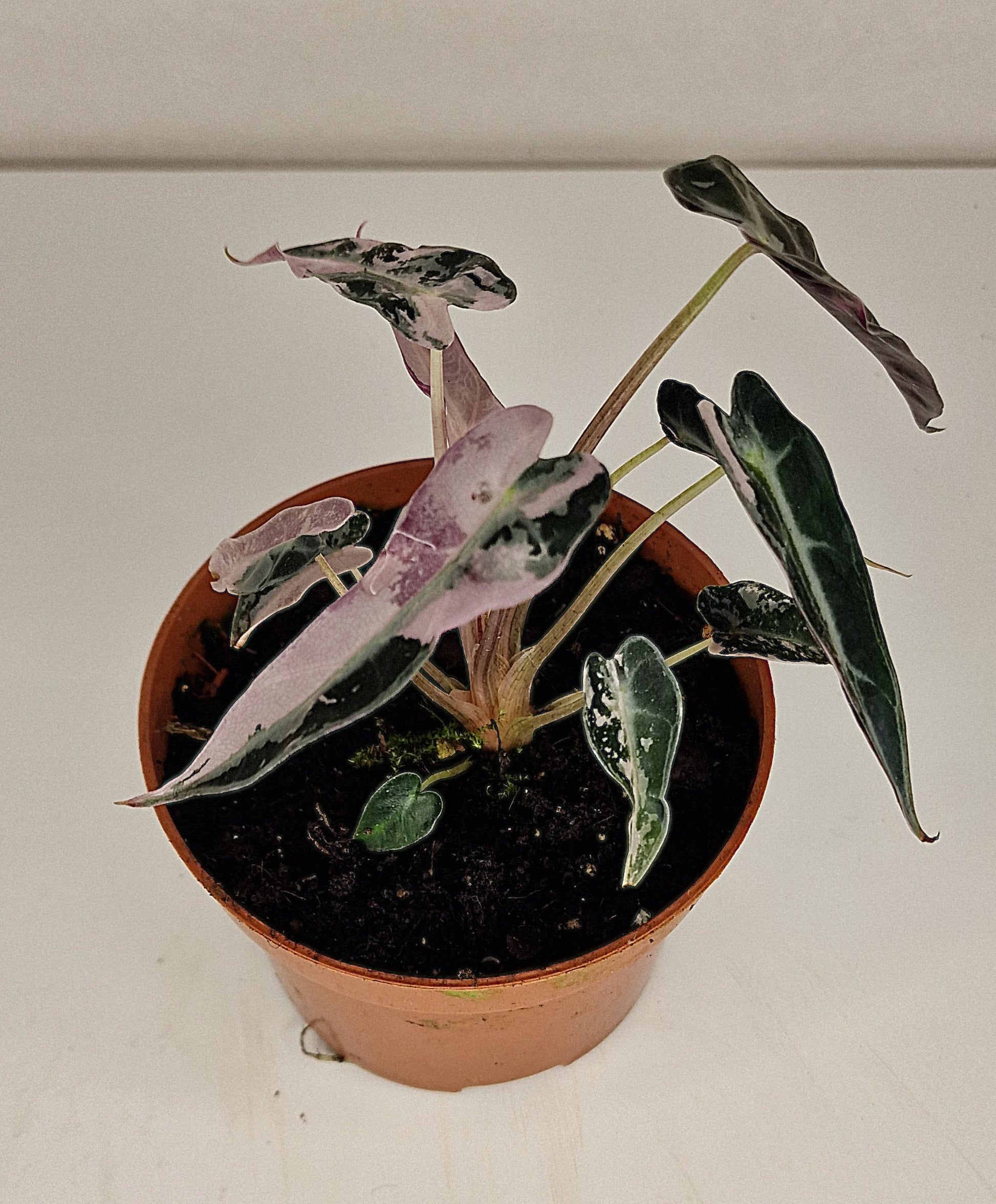 Die Alocasia Bambino Variegata besticht durch ihre kompakte Wuchsform und die einzigartige Blattzeichnung in Grün und Cremeweiß. Ihre spitz zulaufenden, glänzenden Blätter machen sie zu einem stilvollen Blickfang auf jedem Pflanzenregal – perfekt für Liebhaber seltener Varietäten.